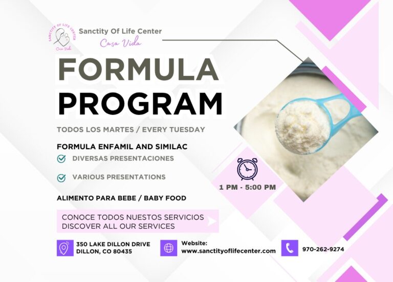 Start date: January 1, 2026End date: December 31, 2026Time: 1:00 pm - 5:00 pmLocation: 350 Lake Dillon Drive, Dillon, CO 80435More info At Sanctity of Life Center, we offer free baby nutrition services for ages 0–12 months to support families from pregnancy through the baby’s first year. When Maria became a mom, she felt joy